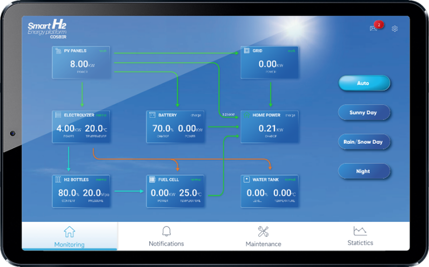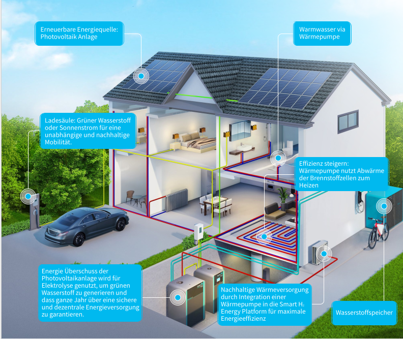 Mit überschüssigem Solarstrom produzieren Sie eigenen grünen Wasserstoff. Diesen nutzen Sie bei grösserem Bedarf und im Winter. Die Brennstoffzelle wandelt den Wasserstoff in Wärme und Strom und Sie werden somit energieautark.