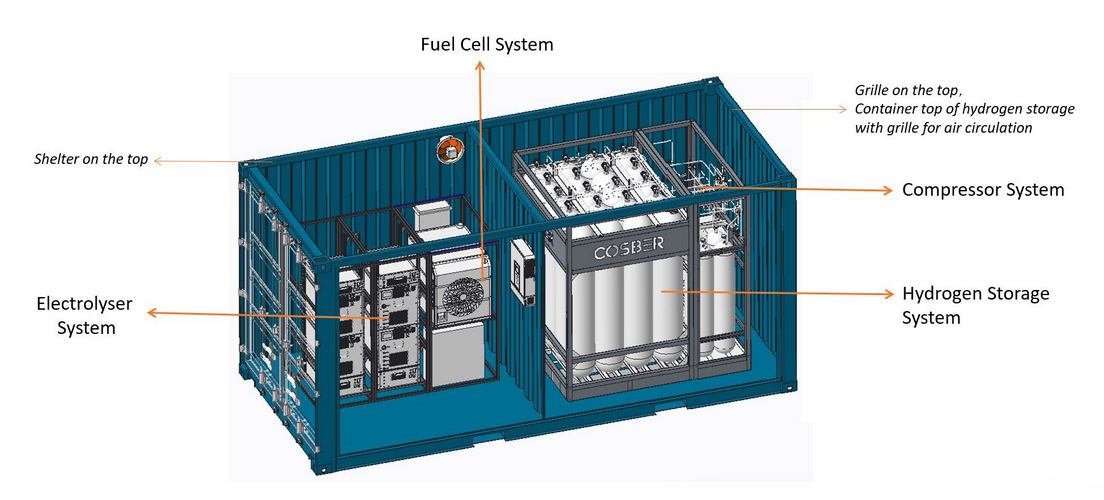 Der gespeicherte Wasserstoff versorgt eine Brennstoffzelle, die Strom zum Laden des Batteriesystems und zur Einspeisung in das